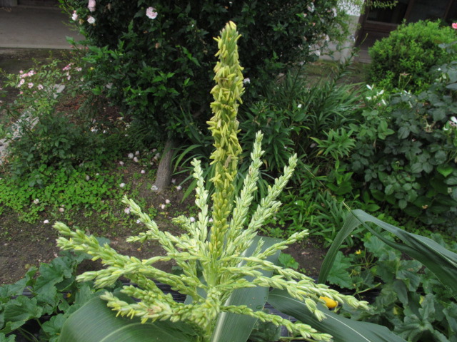 トウモロコシ雄花開花 アワノメイガが寄ってくるので今年はBT剤を散布し、効果を検証中。