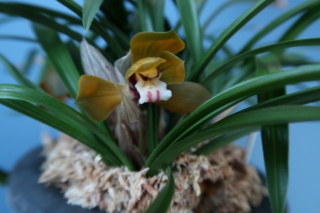 日本春蘭の光琳も咲き始めてにぎやかになってきた。無遮光なので咲き始めは緑朱色の沈んだ色をしているがこれがまた良いもんだ。しばらくすると陽が昇るように輝き出す。
