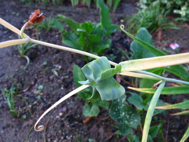 3月18日ブログ、春景色の中のアミガサユリの結実?。あまり見かけませんが何とも奇妙な姿をしています。