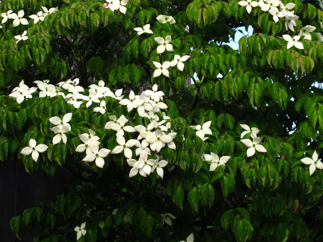 ヤマホウシの花。朝日に映えてきれいです。日陰で見るのもいいですけどね。