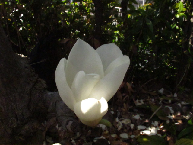 ハクモクレン、強風でボロボロになってしましました。ふと、遅れ咲きのきれいな一花
