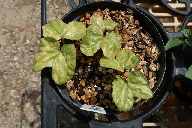 5月下旬に播種して発芽したもの。明日、小鉢への移植。花に柄が入る黄斑入り蝉葉種。