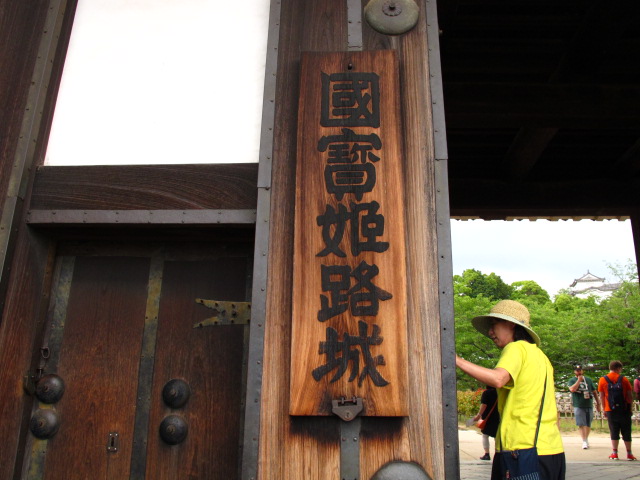 「国宝姫路城」の看板には盗難防止のため?下側に南京錠がつけられていました。何とも変なかんじ…