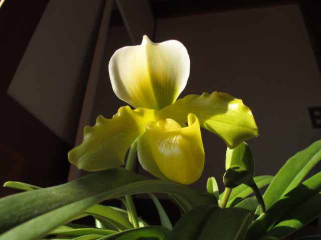 5~6年前にいただいたパフィオ。毎年咲いていますが今年は蕾が5個あります。花期が長いので花のない時期に部屋が明るくなっていいですね。