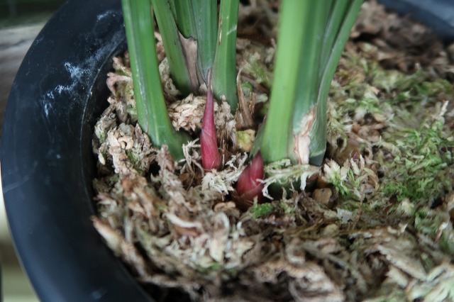 寒蘭「神曲」の新芽  きれいな色をしている。このあと乳白色の新葉が伸びてきてきれい。